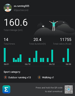 จากระยะทางสะสม 160k ในเดือนมิถุนายนใกล้เคียงเดือนพฤษภาคมเพราะวิ่งยาวไกลกว่า แต่ในละ week วิ่งน้อยเพราะวันพุธมีแข่งวิ่ง Run khan du#2 5k เพซ 5.1-5.3 ทำให้ต้องพักร่างกายในวันจันทร์และอังคาร